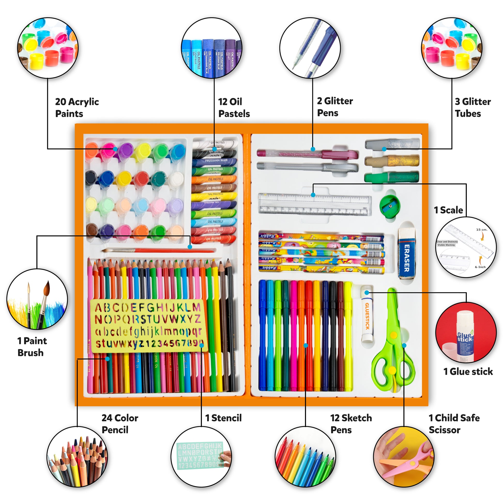 Comprehensive 90-Piece Set - This all-in-one art and craft kit, packed with 90+ high-quality tools set includes: 24 Full-Size Color Pencils, 12 Oil Pastels, 12 Full-Size Sketch Pens, 24 Tempera Shades, 5 HB Cartoon Pencils, 2 Glitter Pens, 3 Glitter Glues (5ml), 1 Jumbo Non-Dust Eraser, 1 Sharpener, 1 Paint Brush, 1 Six-Inch Scale, 1 Stencil, 18gm Glue Stick, 1 A4 Coloring Book, 1 Plastic Scissor